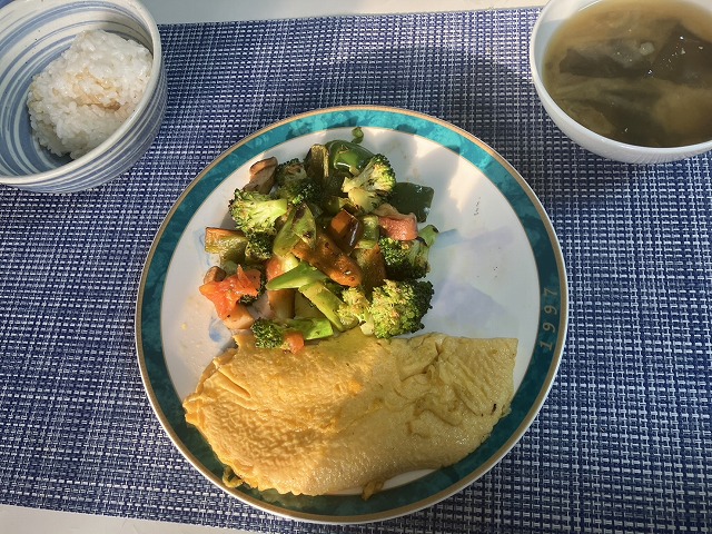 げんちゃんのオムレツと野菜炒め。ホテルのオムレツを作る、と言って作った。これでも相当ましな日でした。